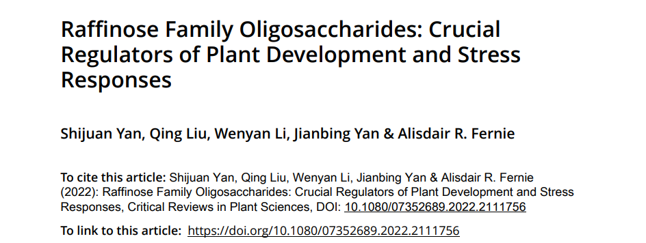近日,基因中心作物品質控製與多組學技術創新團隊在國際學術期刊Critical Reviews in Plant Sciences(JCR一區, IF 6.289)發表題目為“Raffinose Family Oligosaccharides: Crucial Regulators of Plant Development and Stress Responses”的綜述論文。基因中心晏石娟研究員和水稻所劉清副研究員為論文共同第一作者,基因中心晏石娟研究員和德國馬克斯-普朗克分子植物生理研究所Alisdair R. Fernie教授為共同通訊作者。