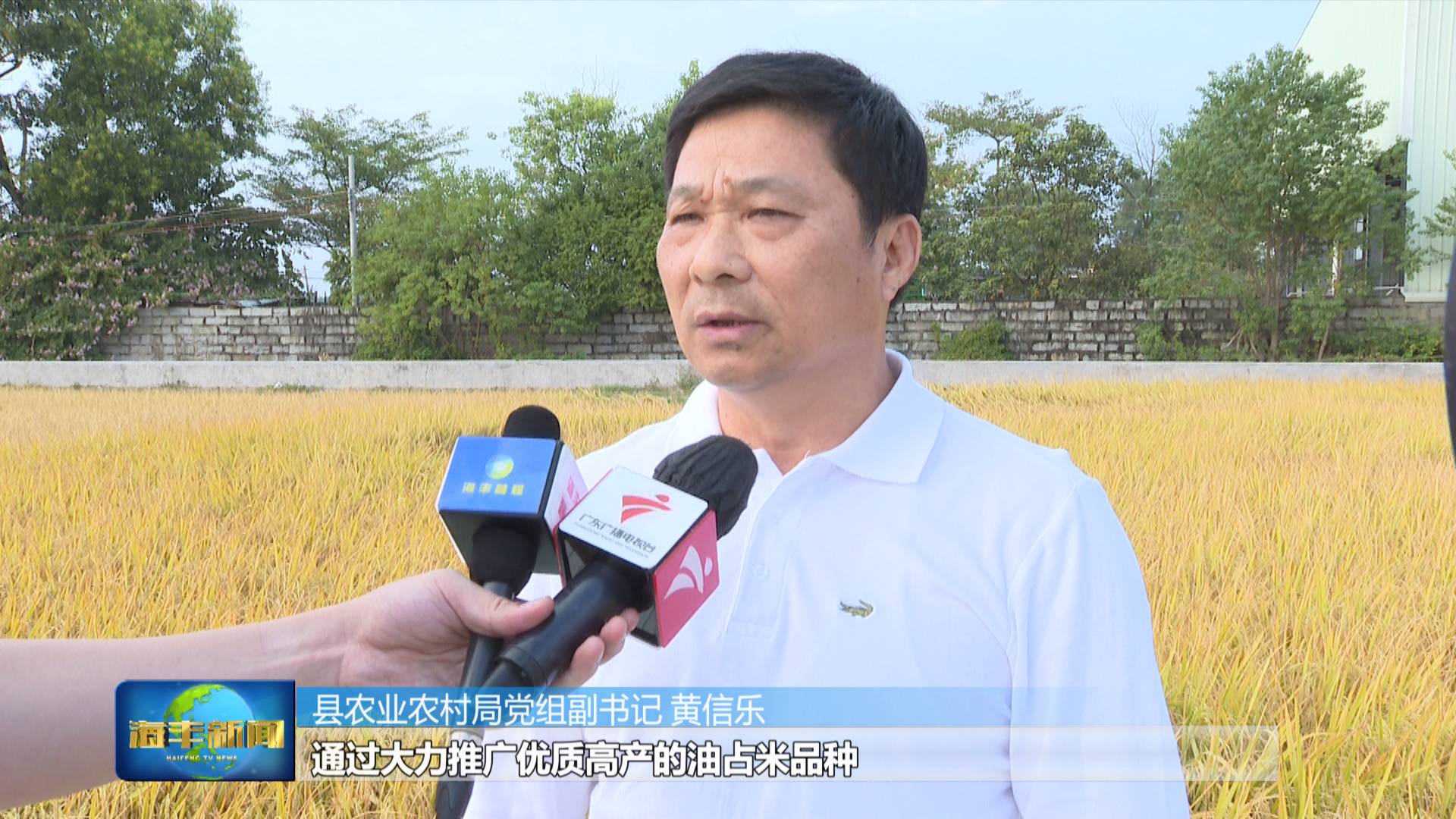 縣農業農村局黨組副書記 黃信樂:今年我們在確保糧食種植麵積的增加,通過大力推廣優質高產的油占米品種,使到優質水稻品種覆蓋率達到90%以上,三是一大批農業龍頭企業進行社會化服務,通過統防統治,采取一係列的措施,取得比較好的效果。
